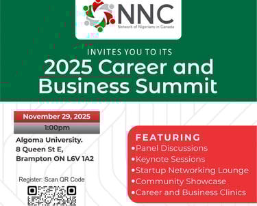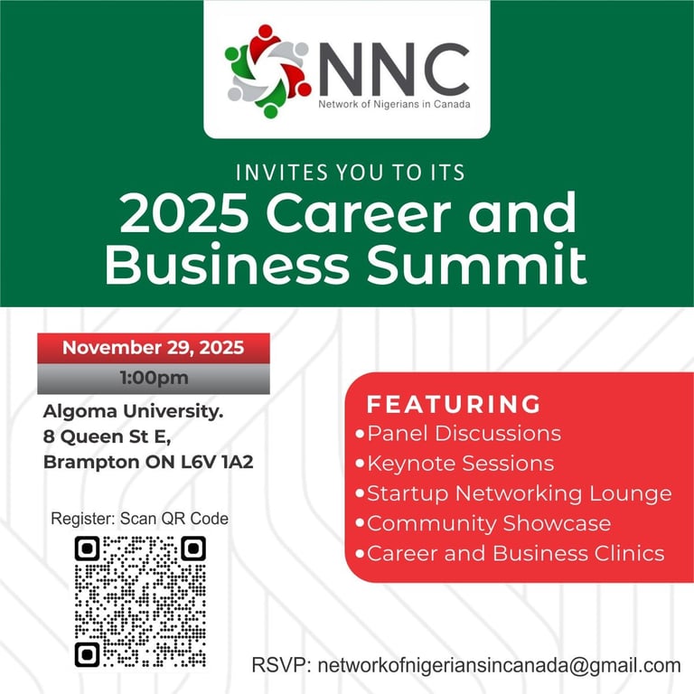 The Network of Nigerians in Canada (NNC) invites you to attend the 2025 Career & Business Summit, happening on Saturday, November 29, 2025, at Algoma University, 8 Queen St E, Brampton Campus from 1:00 PM.